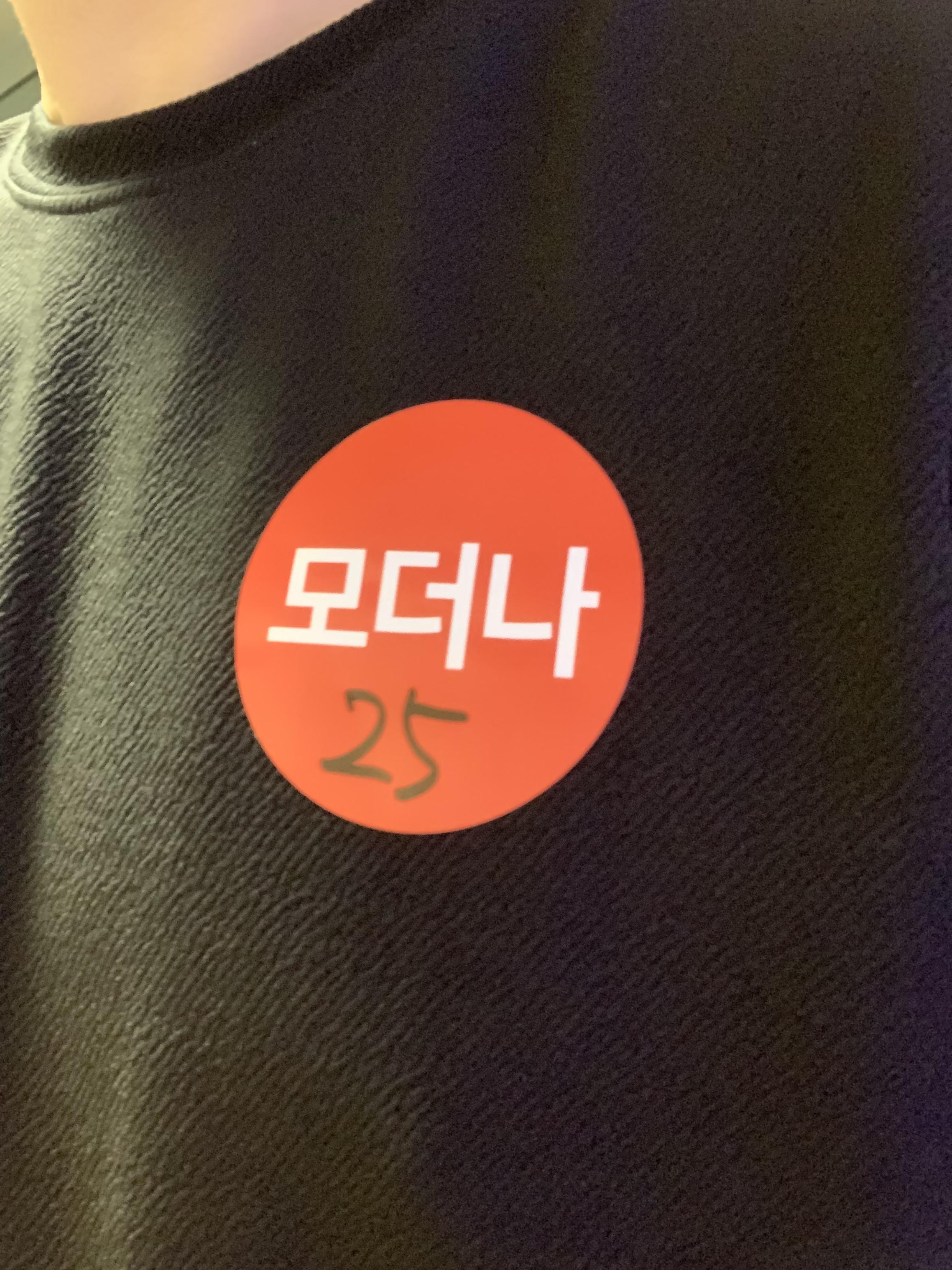 얀센 + 모더나 추가접종 확인 후 가슴팍에 스티커를 붙여줬습니다 ㅋㅋ 화이자는 보라색!