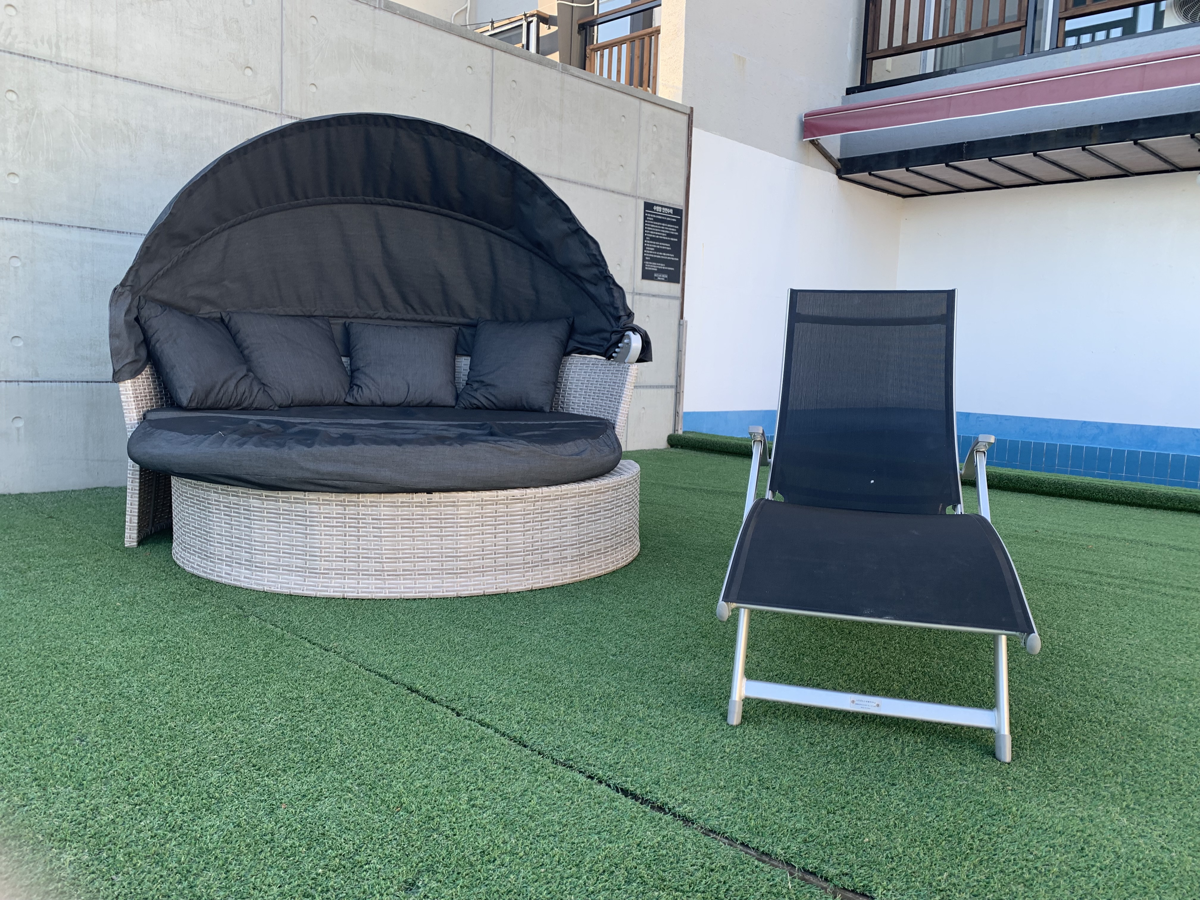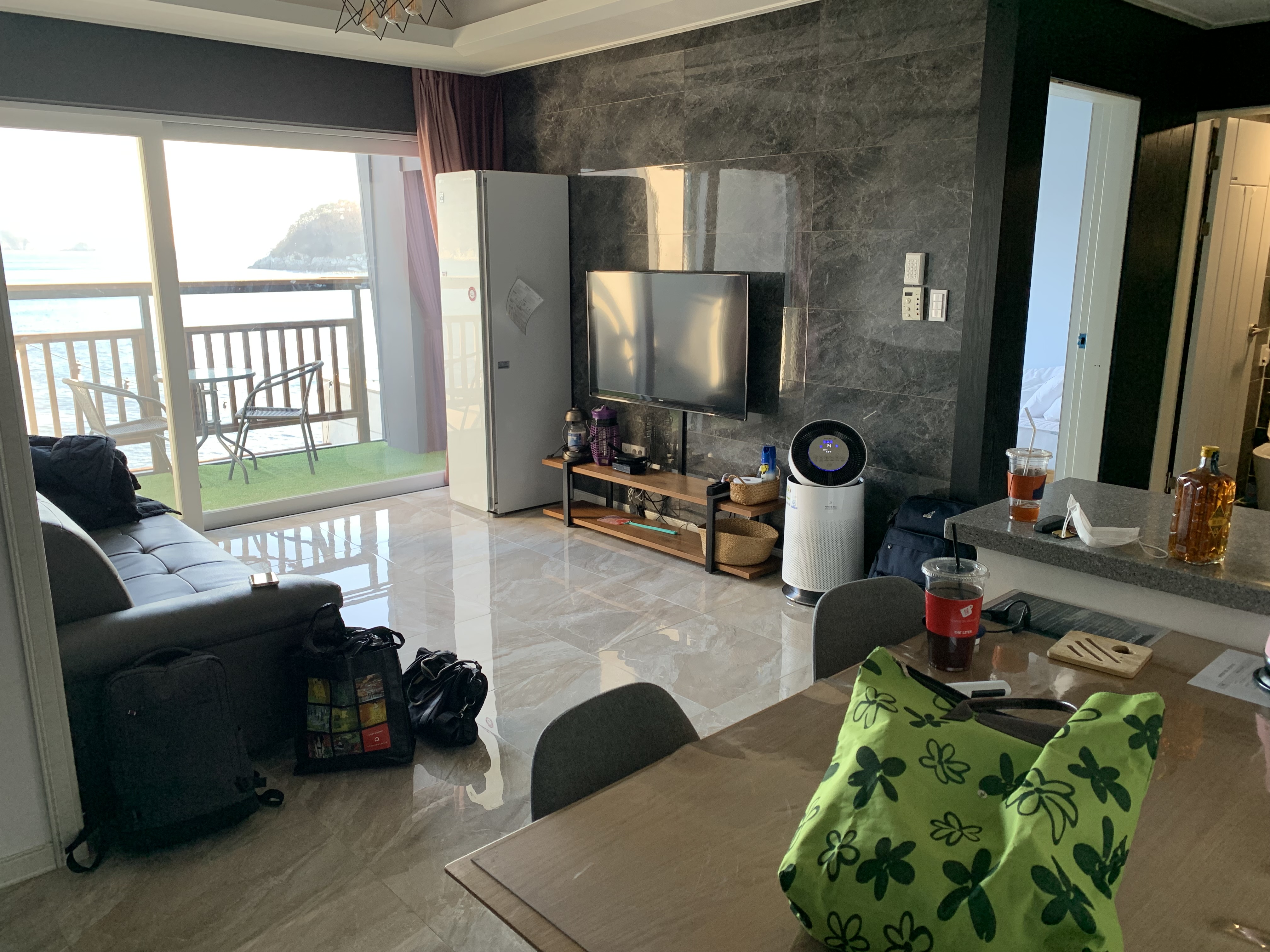 소파, TV, 공기청정기, 에어컨 등이 구비되어 있고 스타일러까지 있어서 한번도 사용못해본 우리는 각자의 패딩을 돌려가며 사용했네요 ㅋㅋ 테이블과 의자가 위치한 작은 테라스도 확인할 수 있습니다.
