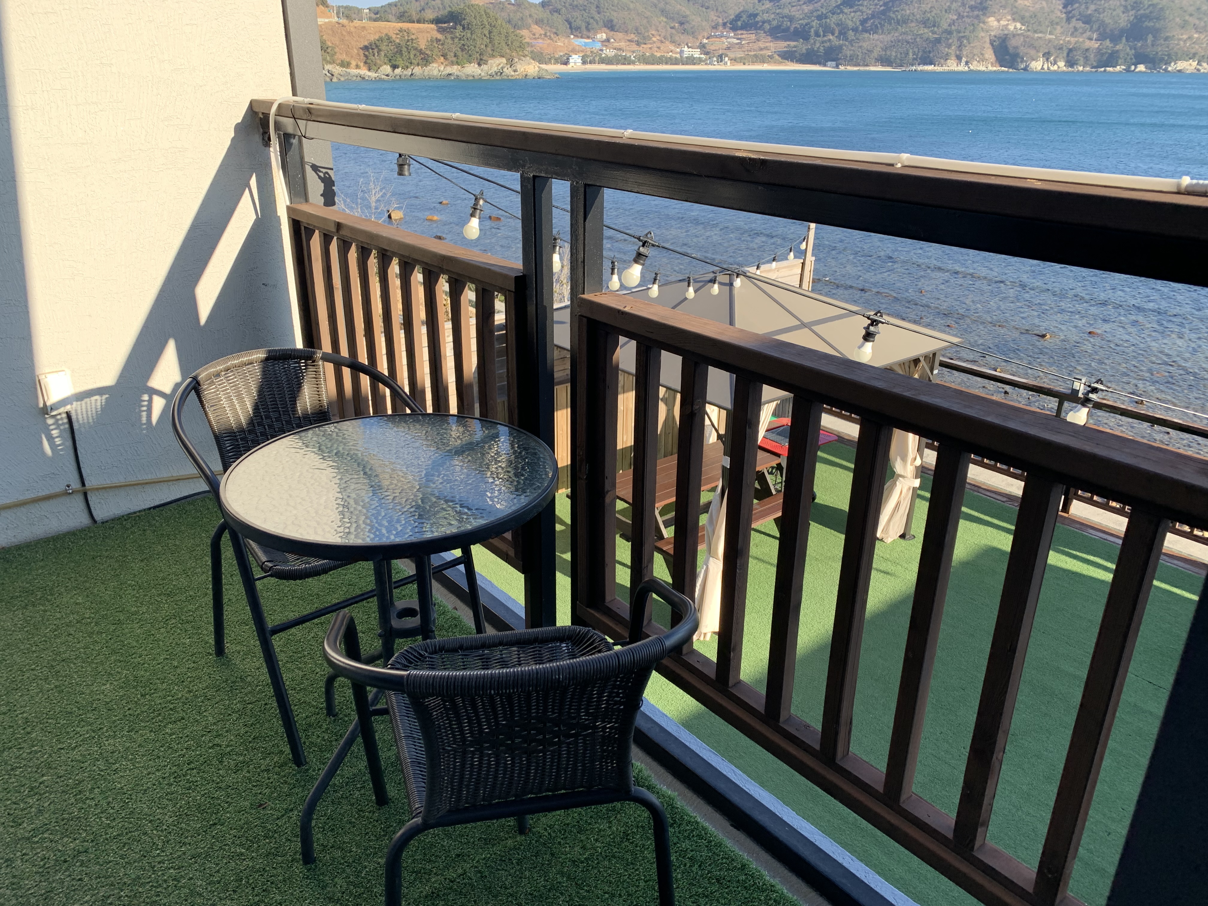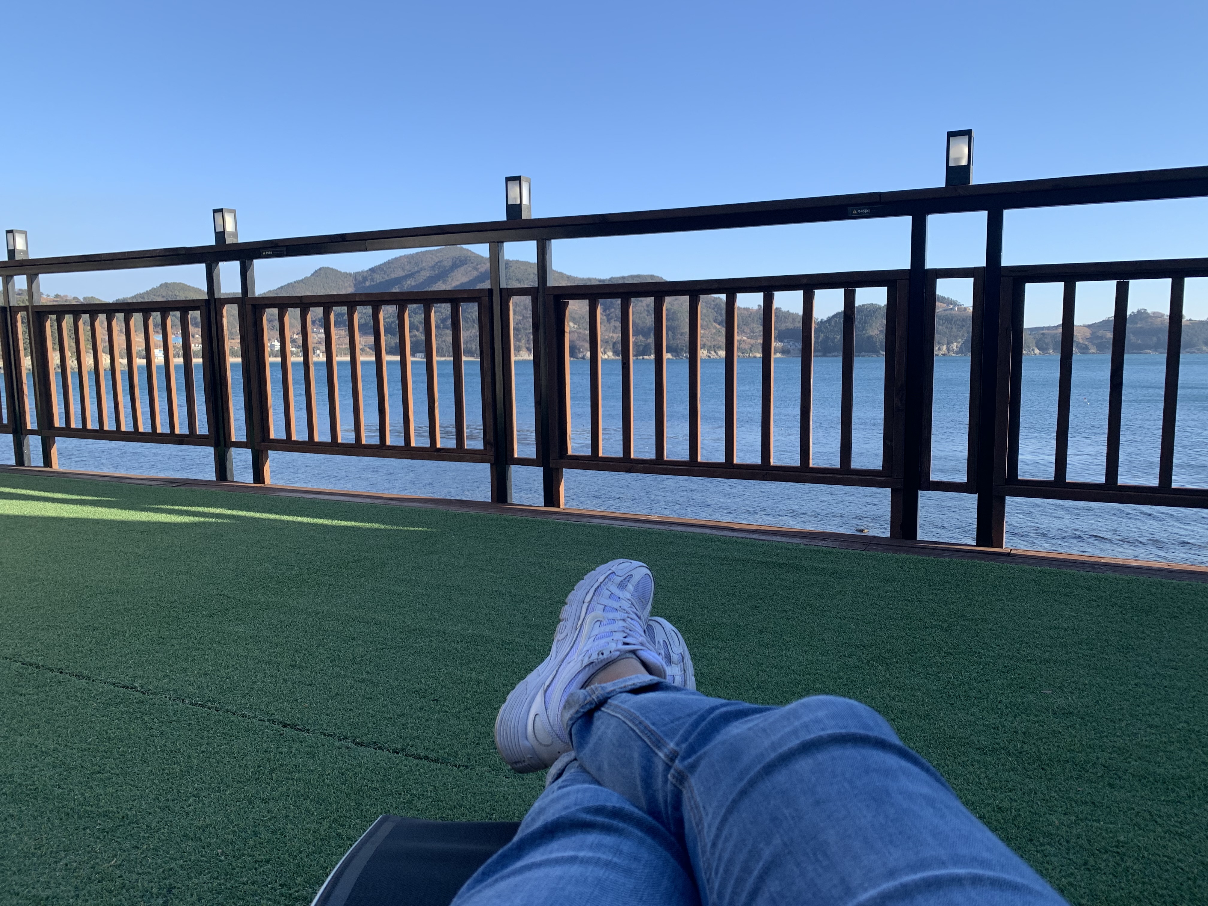 마당에 위치한 의자에 앉으며 보이는 광경입니다. 아름다운 남해 바다와 듬성듬성 솟아있는 육지들을 보고있으면 마음이 편안해지네요.