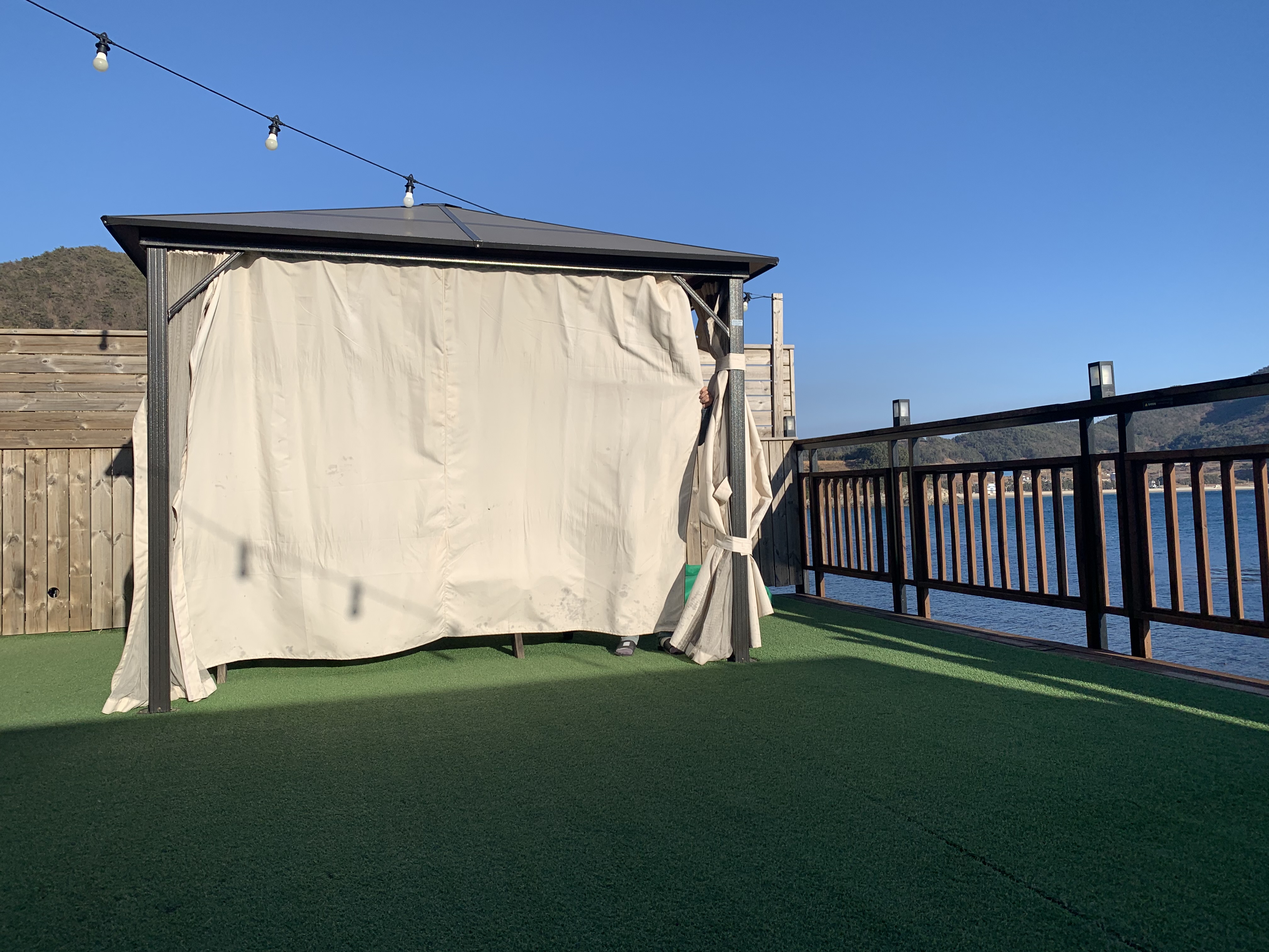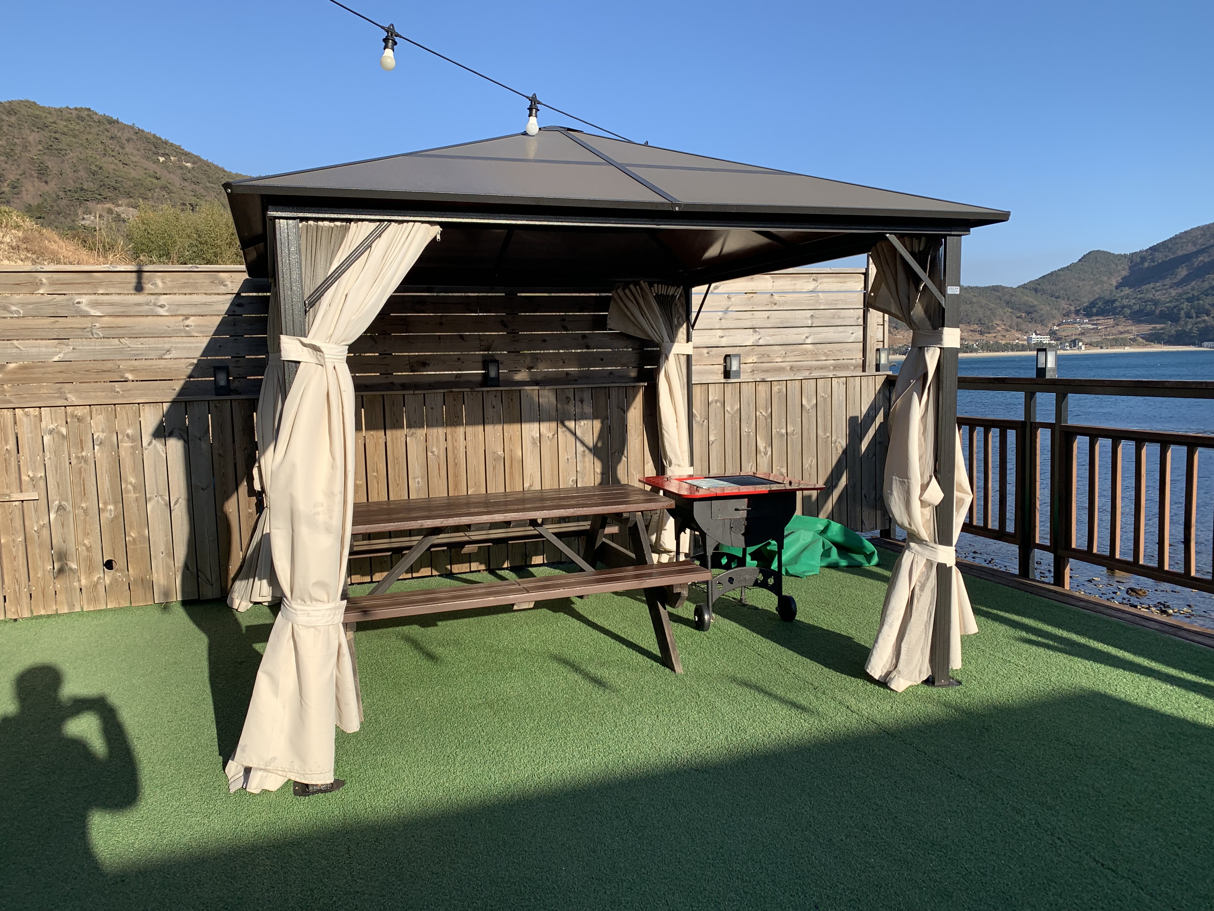 바람이 엄청 불었는데 바람을 막을 수 있는 커텐과 모기장으로 바람을 막아보려 했습니다만.. 바닥을 고정할 수 있는 곳이 저희가 못찾은건지 없는건지 바람을 막지못해 바베큐 대충먹고 방으로 들어갈 수 밖에 없었네요 ㅠ