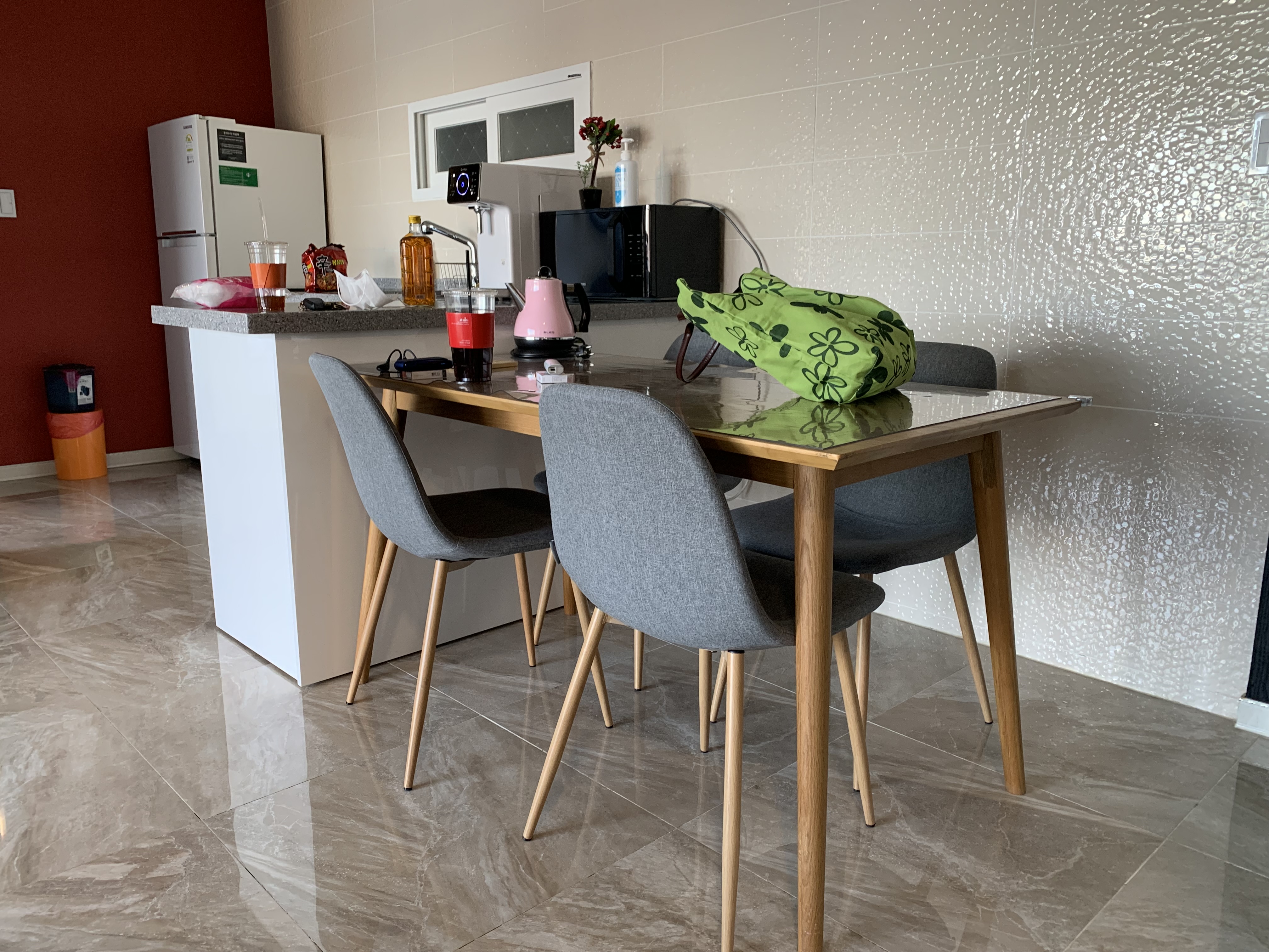 숙소 내부 주방과 테이블 샷입니다. 냉장고, 정수기, 전자렌지와 같은 기본적인 것들은 다 구비되어 있네요.